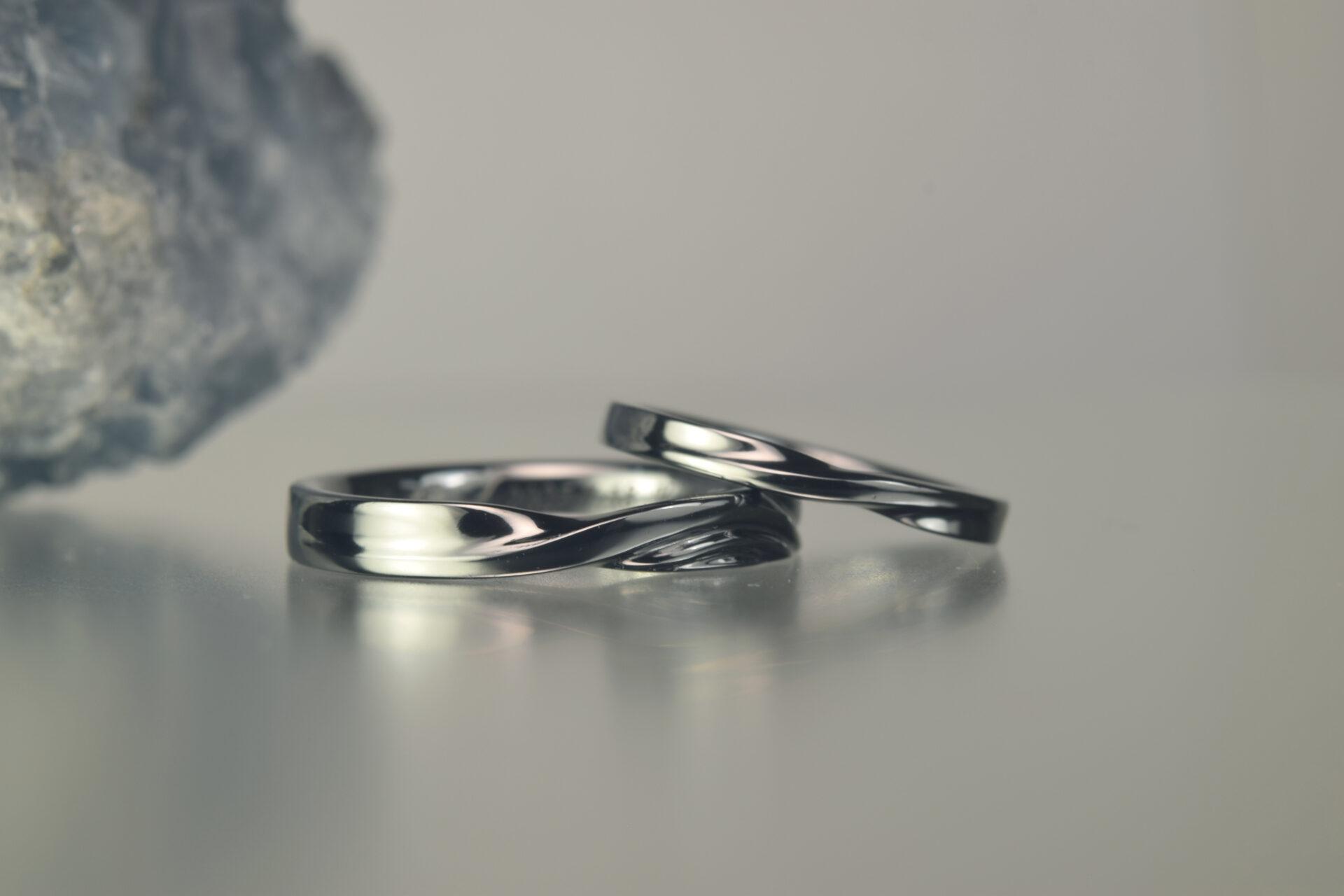 完成した結婚指輪は、重厚で深みのあるタンタル素材に、おふたりの物語を刻んだ特別なデザイン。