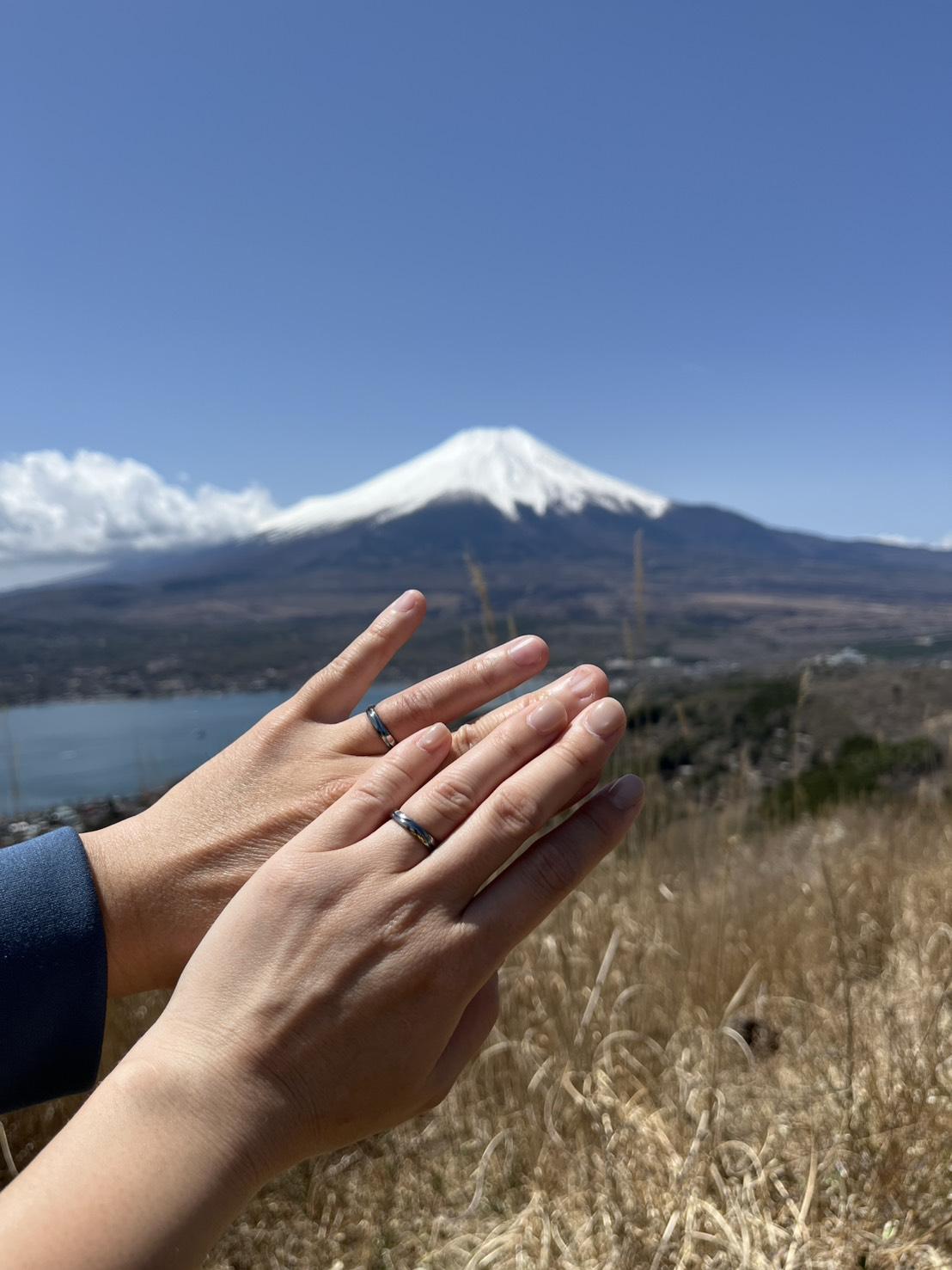 完成したおふたりの指輪をはめた記念写真が届いたのは、日本の象徴・富士山を背景にしたとても美しい一枚でした。