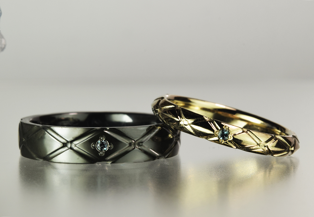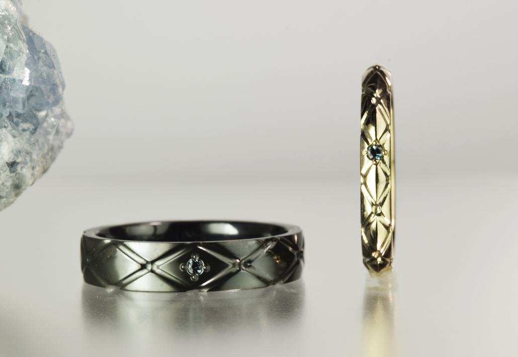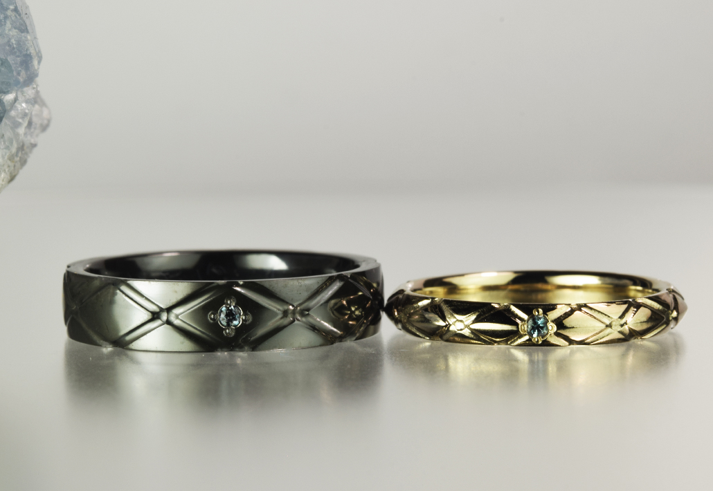 彼はブラック・私はK18シャンパンゴールドの結婚指輪|違う素材でデザインと石<アレキサンドライト>が同じで大満足!動画あり[OR-1888]
