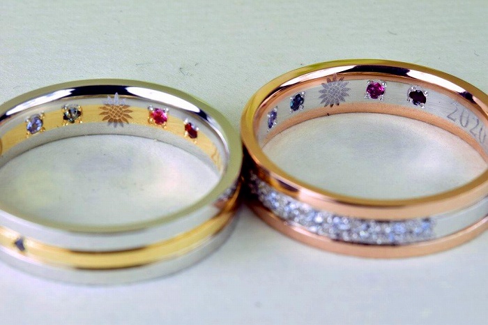 お二人の想い出の場所に咲いていた向日葵をレーザー彫刻し家族の誕生石を入れ 本当に素敵な結婚指輪になりました。