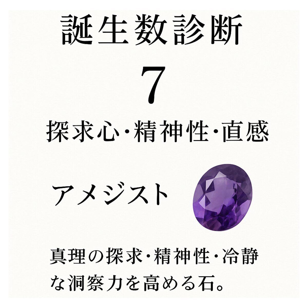 アメジストは、精神性と直感を高め、冷静な判断力を引き出します。タンザナイトは、その神秘的な青紫の色合いで、内面的な探求と心の安定を象徴しています。どちらの石も、誕生数・運命数7の持つエネルギーにぴったりの宝石です。