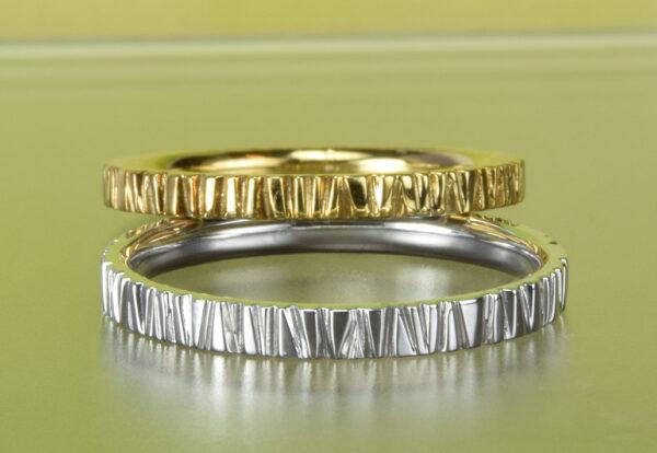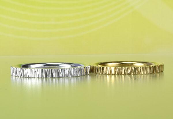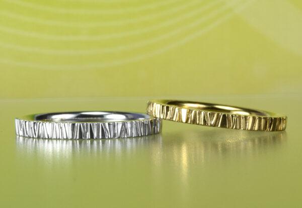彫り込んだ線の重なりでカタチを描き出す絵画の技法<アシュール>を結婚指輪のデザインに。型を使わずタイトル通りに一本ずつ手作業で彫り込んだ模様は、一本一本違いリングは世界に一本のオンリーワンのものに。線の深さ、密度、リングの幅、素材、豊富に選べるのも工房があるセブンドリームスならでは。もちろんアレルギー対応素材<チタン><ジルコニウム><タンタル><ハフニウム>での製作もOK.
