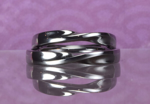 透明感ある黒い光沢を活かすよう、面の波打ちを抑えた仕上げが、リング表面の流れるようなアールの変化を強調します。