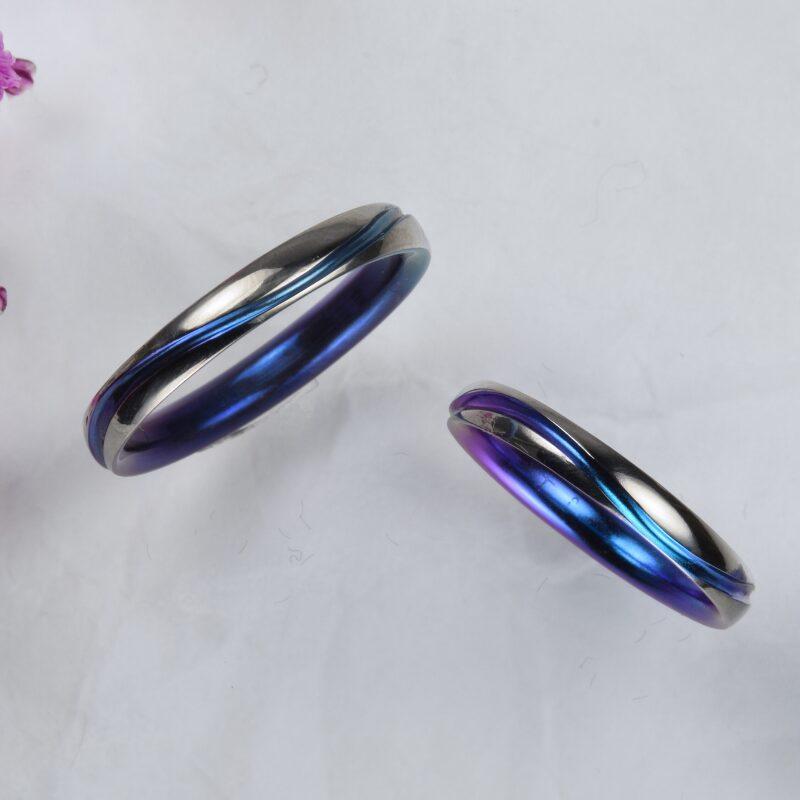 リング表面に広く細く・・・波打つラインを美しいブルーで染め上げました。