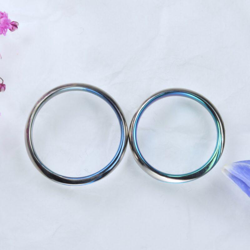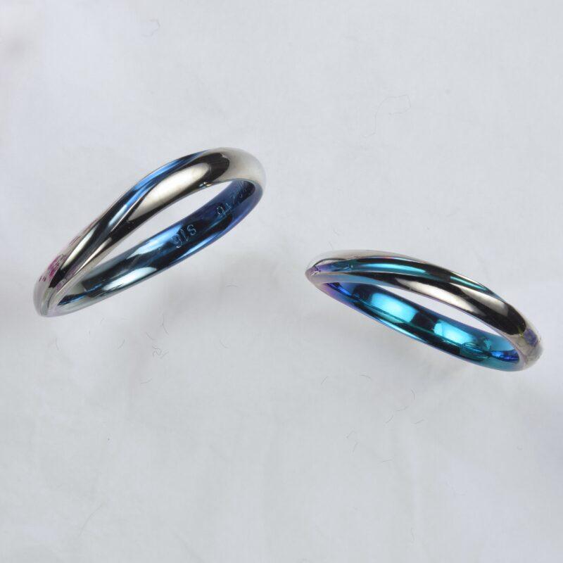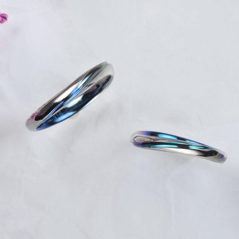 波打つように流れるブルーのラインが印象的な結婚指輪