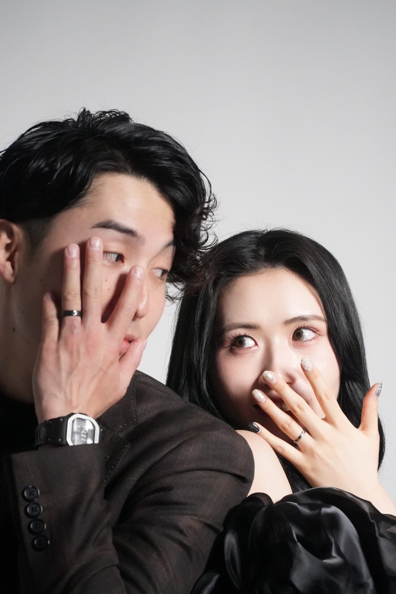 ブラックジルコニウム結婚指輪を付けて写真撮影した写真をラインに送ってきていただきました。素敵です。カッコイイ二人にぴったりだと思いました。お幸せに~♡♡♡