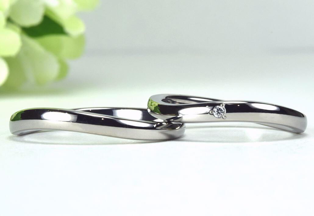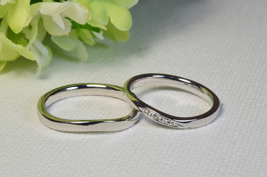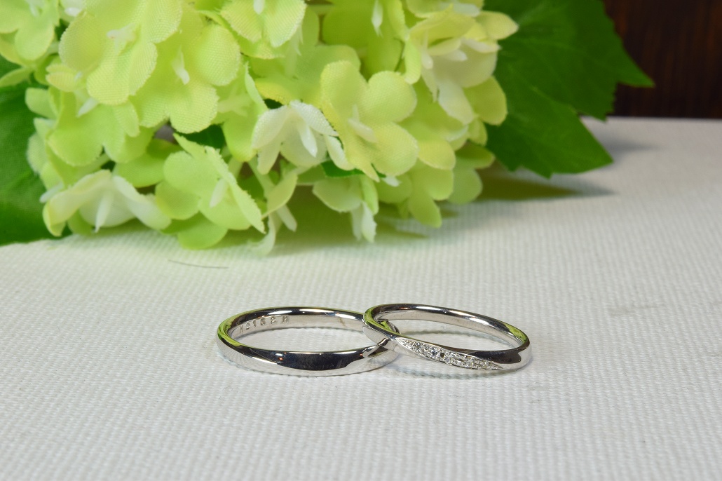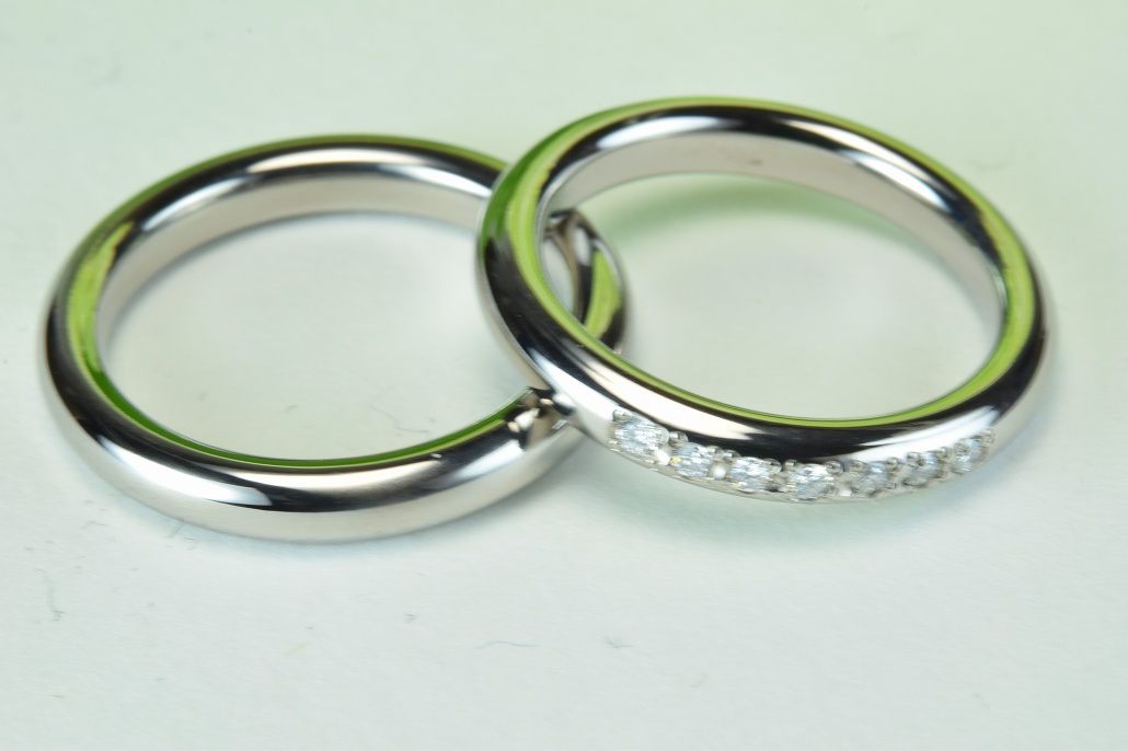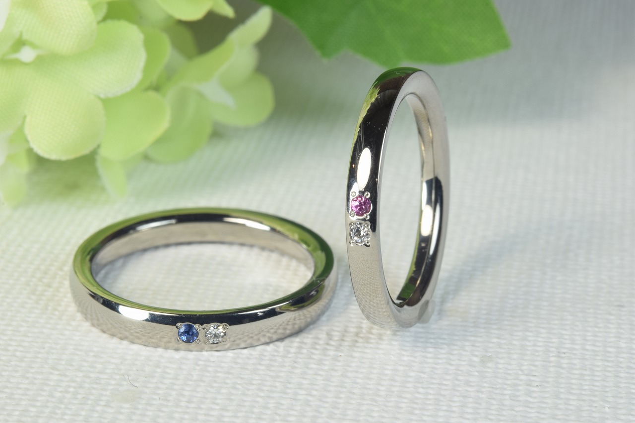 オリジナル結婚指輪【素心2】道【MG-014】シンプルな中に、表面研磨、特にゆびなじみ部分のカーブの絶妙さは、ゆび通りの良さ、気にならない着け心地を生み出します。シンプルだからこそ細部にこだわるプレミアムベーシックモデルです。 二つ並んだ宝石は「これからも2人並んで歩む道」を表します。