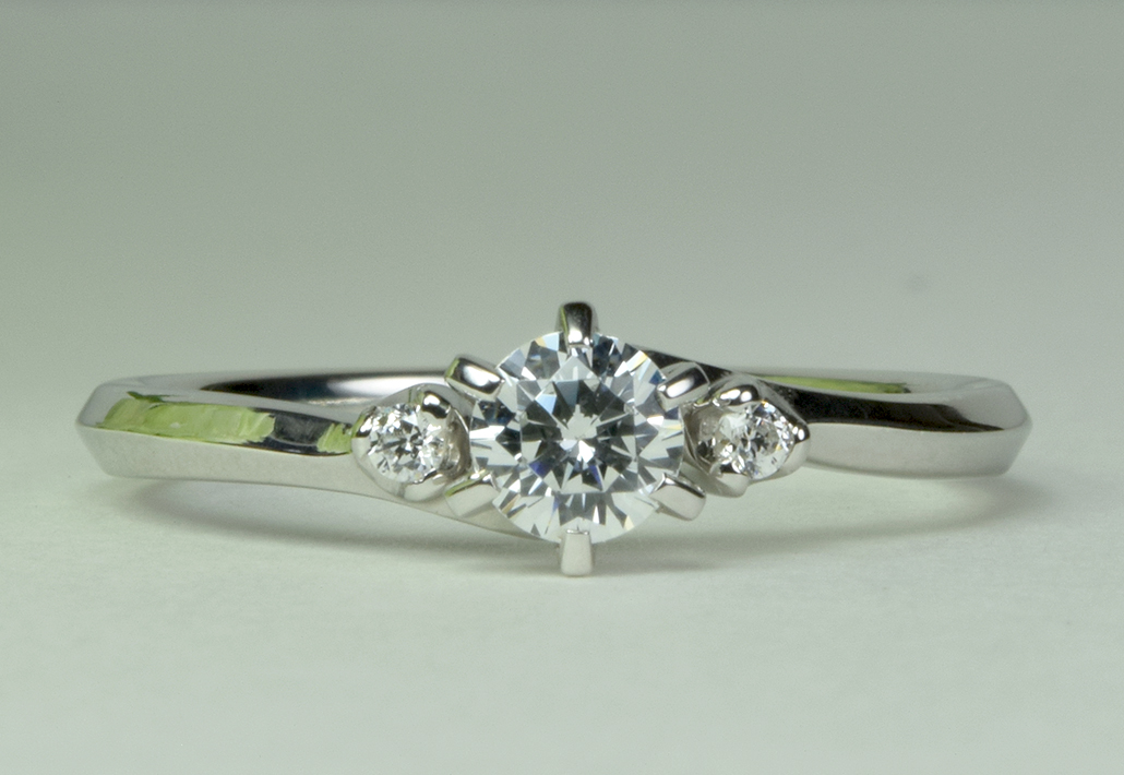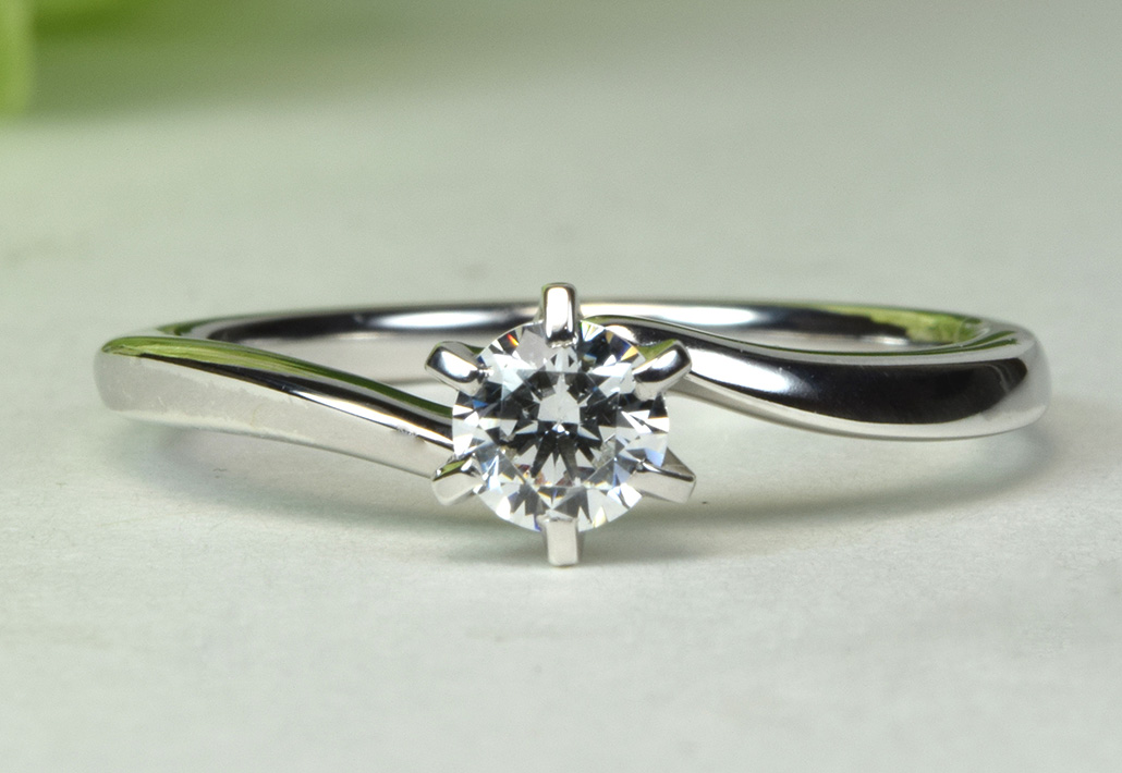 婚約指輪|上下からそっとダイヤを包むアーム~ツイスト EG-010-6P左右から伸びた手のひらがダイヤをそっと包むような雰囲気が、カービーなフォルムと相まって優しい印象を伝えるデザインです。デザインのポイントは、ただカーブするのではなく、少しひねりながら柔らかくダイヤへとつながるエッジとそれをかたちづくる面の微妙な変化です