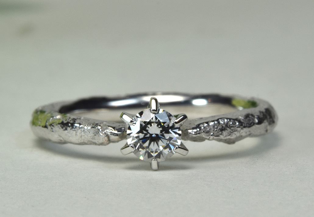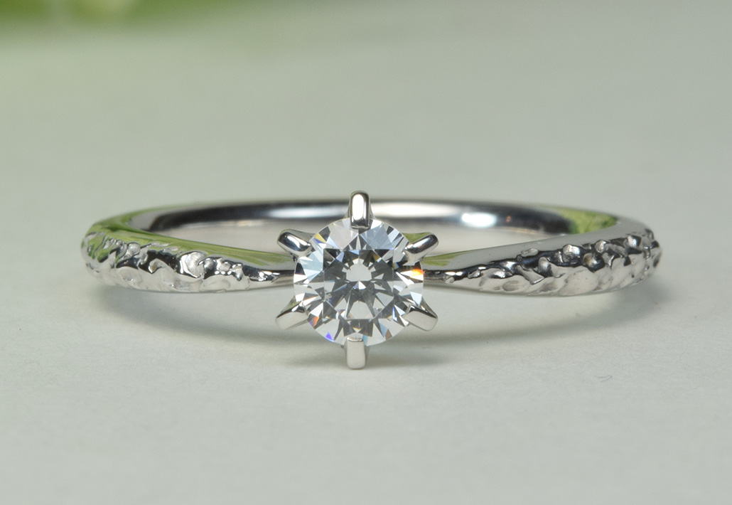 婚約指輪|和紙のテクスチュアの和風 EG-001-6P1王道のソリテールをクラフト感あふれる和柄でカスタマイズ。アームに和紙の柔らかな風合いのテクスチュアを施した和のエンゲージ。不動の人気モデル、中絞りタイプのソリテールのアームにセブンドリームスオリジナルの人気アレンジ<和紙>テクスチュアを施したクラフト感あふれるモデルです。