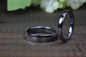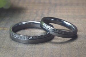 タンタルとブラックジルコニウムの結婚指輪。2つの黒い素材の質感と色味の違いがわかる画像