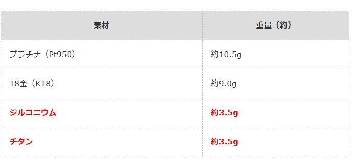 プラチナや金の重厚感も魅力ですが、軽さを求める方にはチタン・ジルコニウムの方が断然おすすめ。
