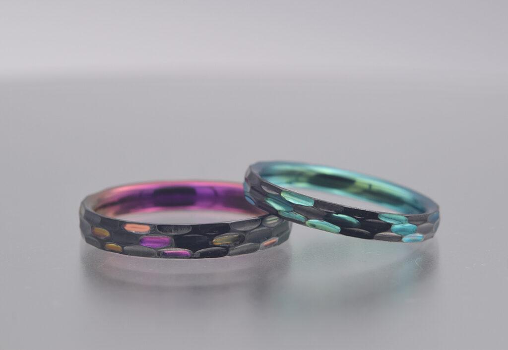 2色以上の色を組み合わせたデザイン。個性的で目を引く仕上がりになります。特にチタンとタンタルは角度によって色合いが変わる特性があり、見る角度によって異なる表情を楽しめます。