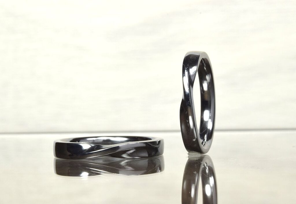 ゼロから作る世界に一つだけのリング。50代になると、周囲への気兼ねが少なくなり、こだわりを遠慮なく盛り込んだデザインを求める方が増えます。長年の人生経験や価値観を反映した、まさに「大人の結婚指輪」が実現します。【画像はブラックジルコニウム&タンタルの異素材結婚指輪】<金属アレルギー対応>