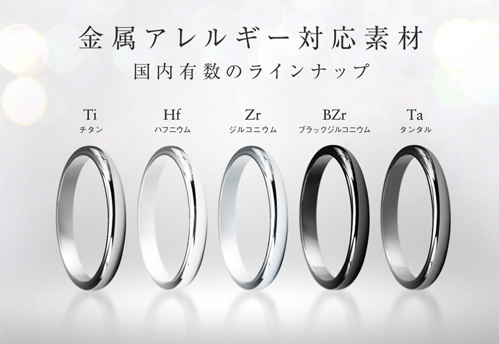 セブンドリームスでは、そんな不安を解消するために、金属アレルギーにも対応の4種類のレアメタルでの製作に対応しております。(※詳しくは以下の<金属アレルギーの方も安心の素材展開>の項を)