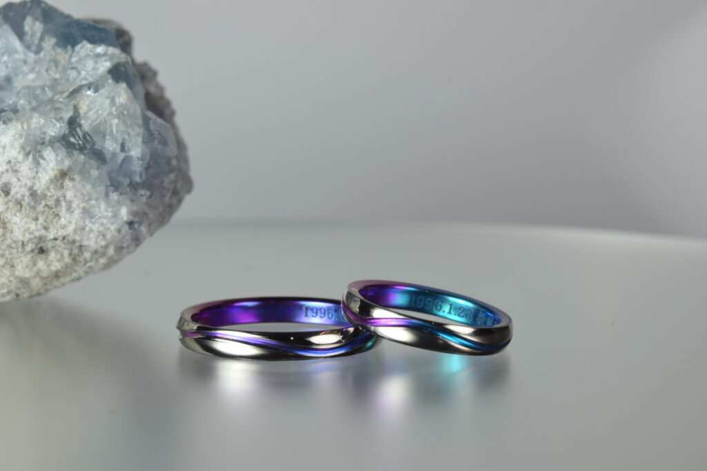 タンタルは単色だけでなく、複数の色を組み合わせたバイカラー発色も可能です。リングの内側と外側で異なる色を選んだり、デザインによって複数の色を配置したりと、あなただけのオリジナリティあふれる結婚指輪が実現します。