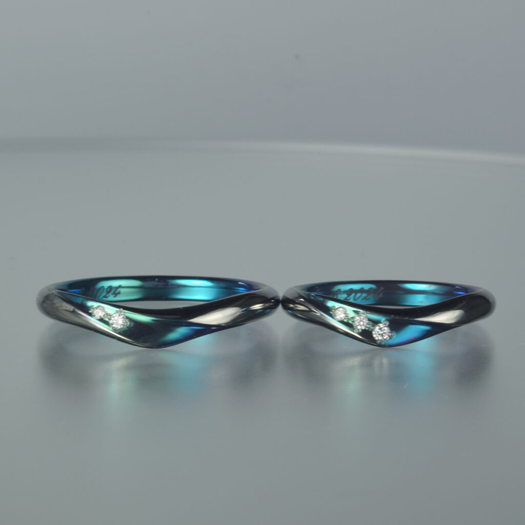 お客様のコメント:「タンタルの青色の鮮やかさに一目惚れしました。結婚指輪とは思えないほど個性的で、身に着けるたびに嬉しくなります」(福岡県・Sさんカップル)