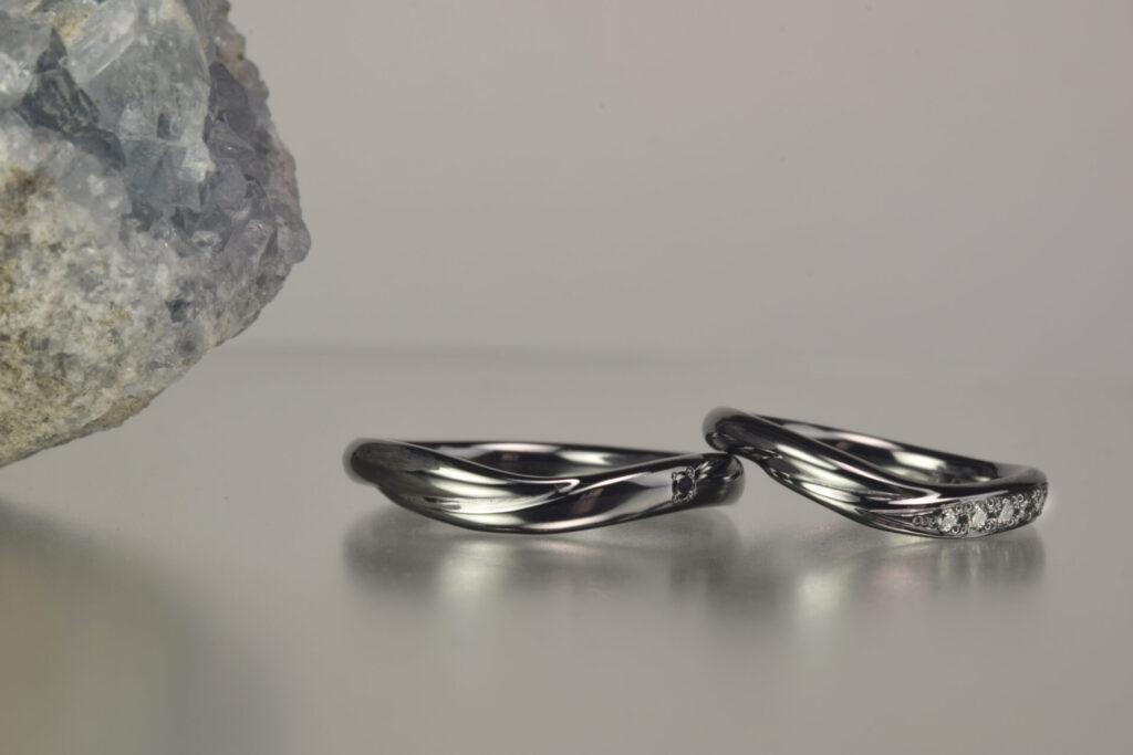 お客様のコメント:「二人で海辺で過ごした思い出をリングにしたいと相談したところ、このデザインを提案していただきました。波紋模様とグラデーションが海を彷彿とさせて、毎日眺めるのが楽しみです」(東京都・Tさんカップル)