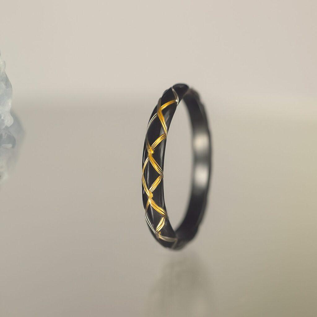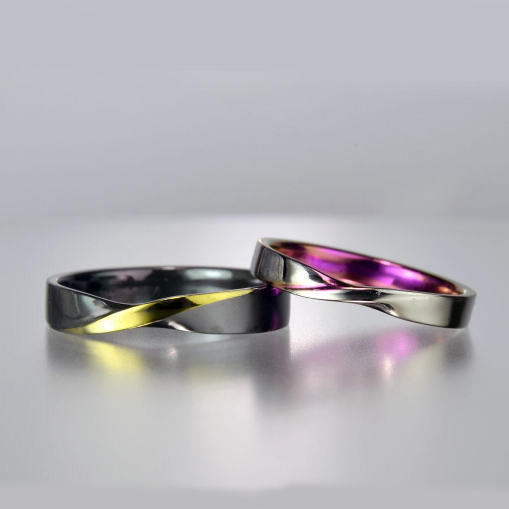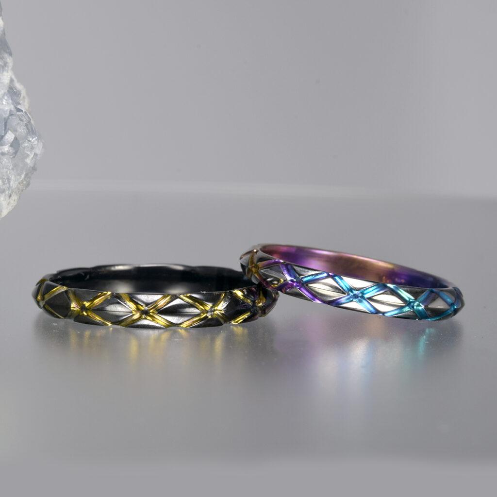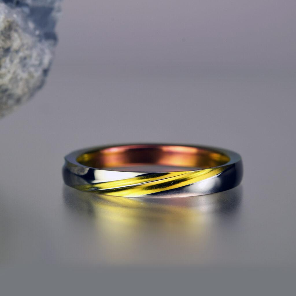セブンドリームスのカラーリング対応素材(チタン・ジルコニウム・タンタル)は、ビビッドな黄色を表現できます。中でもタンタルは、黒地に浮かぶような高発色で特におすすめ。グラデーションやバイカラーとの組み合わせで、より印象的なデザインも可能です。